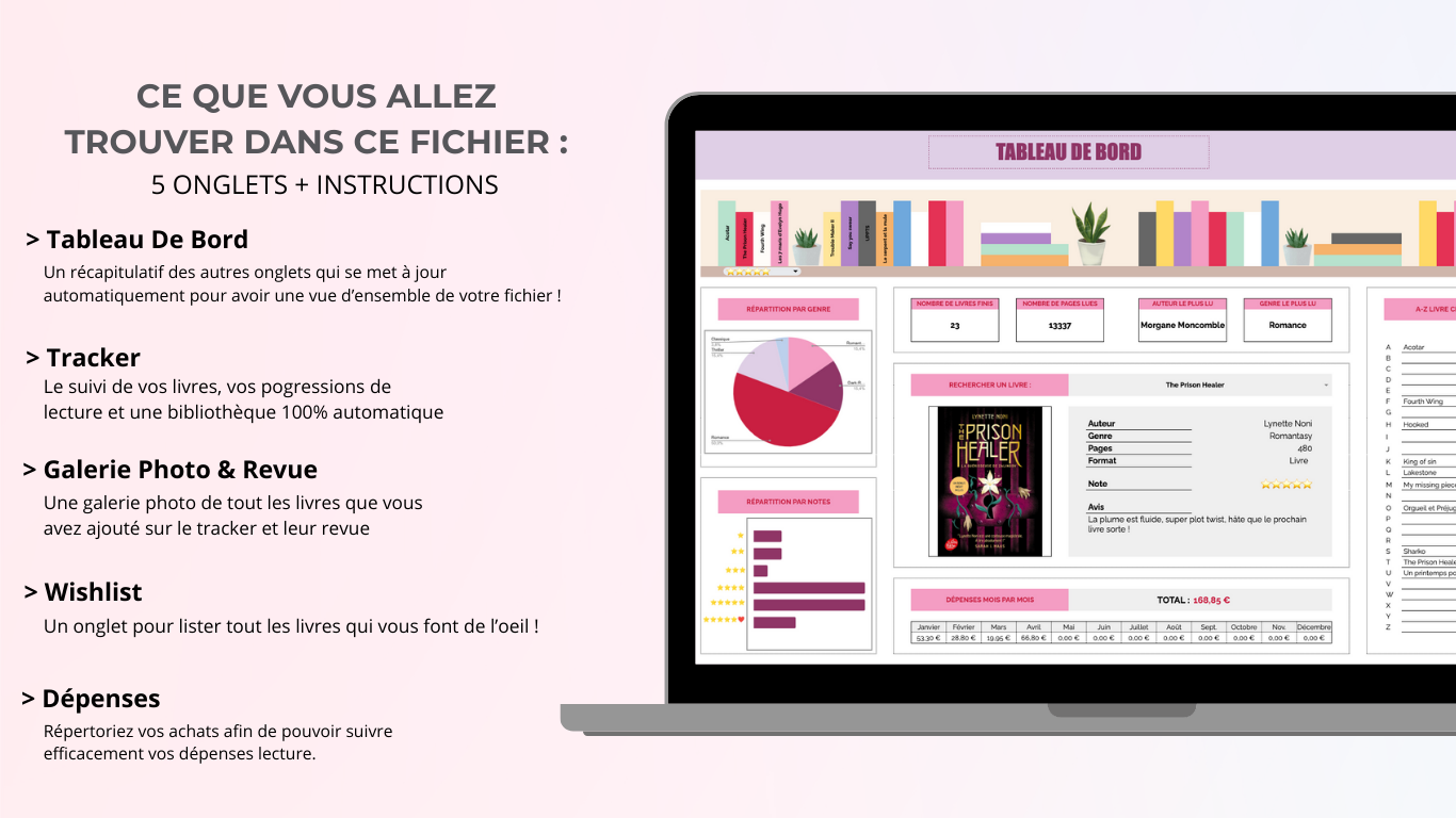 Ce fichier a été conçu spécialement pour suivre de façon précise vos lectures, faire votre wishlist ou encore suivre efficacement votre budget livre !